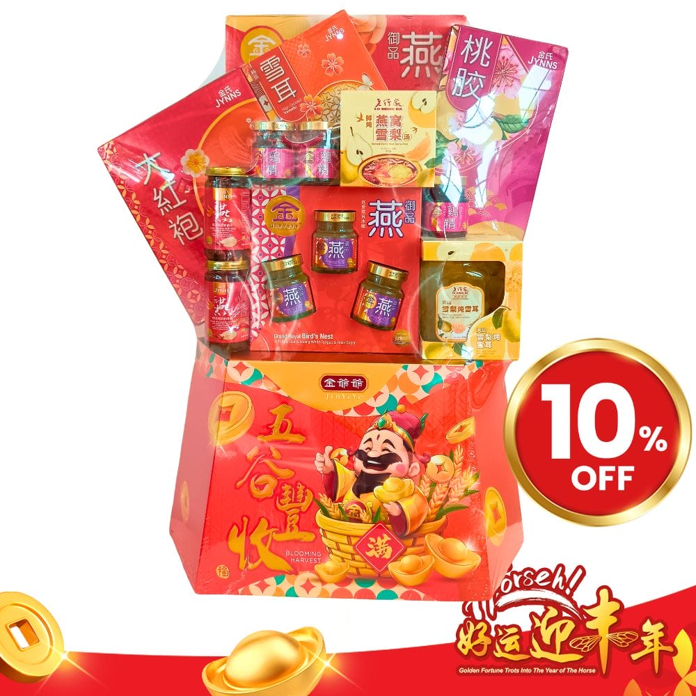 The Blooming Harvest (H01A) from JinYeYe is a health-focused hamper designed to symbolize a fruitful and abundant year (Five Grains Harvest). It features a combination of traditional wellness tonics and premium tea, packaged with a distinctive “Bucketful of Gold” decorative element.